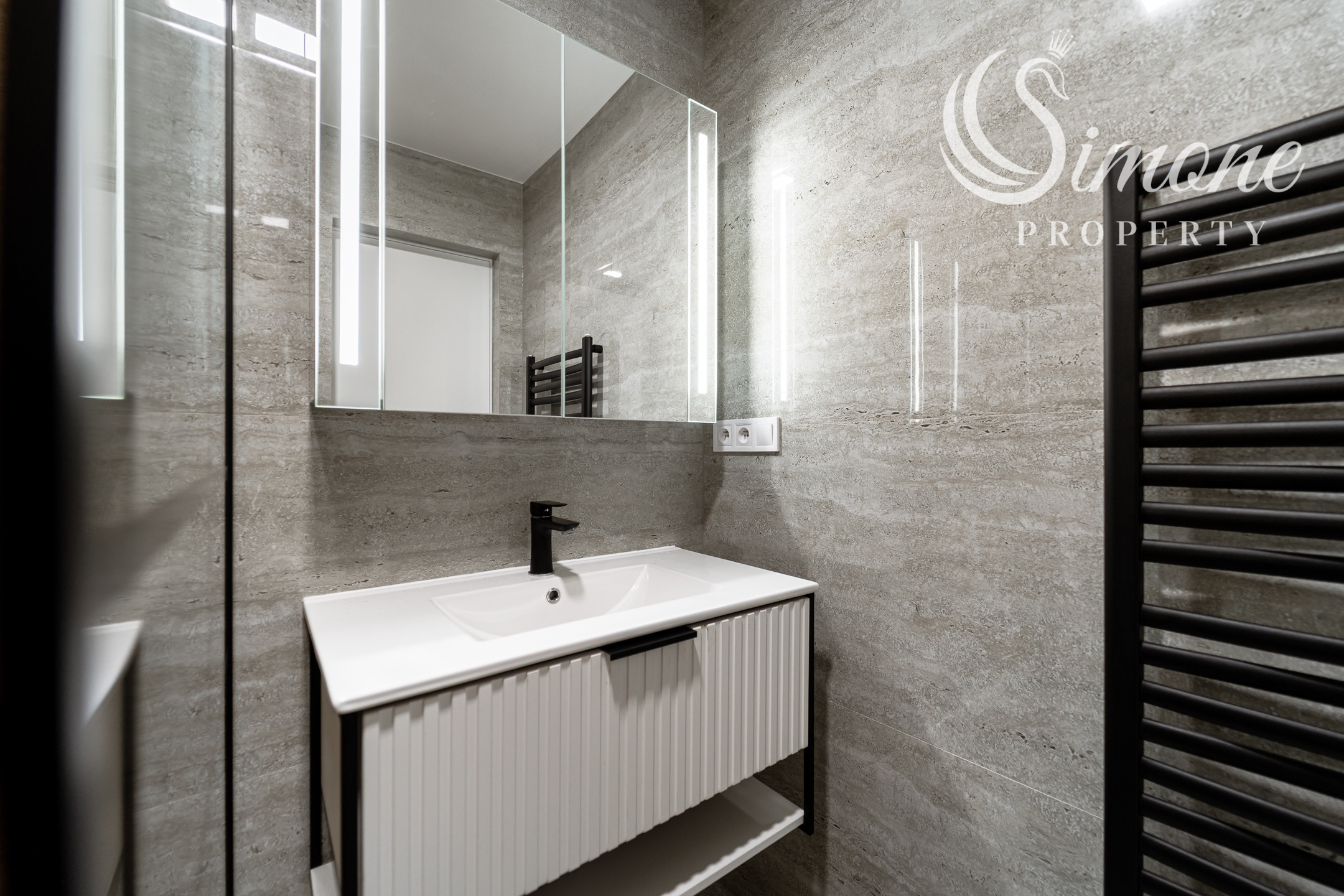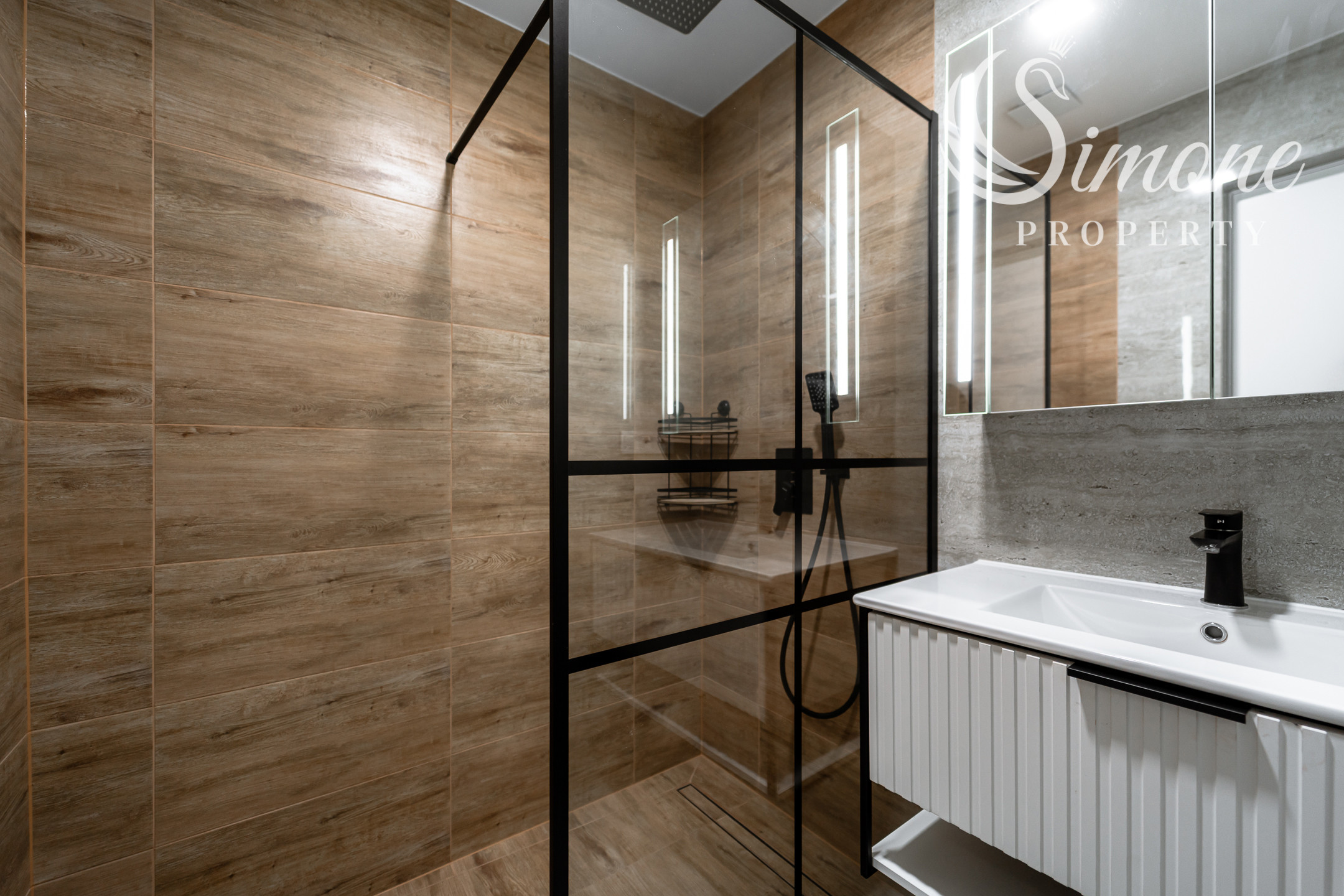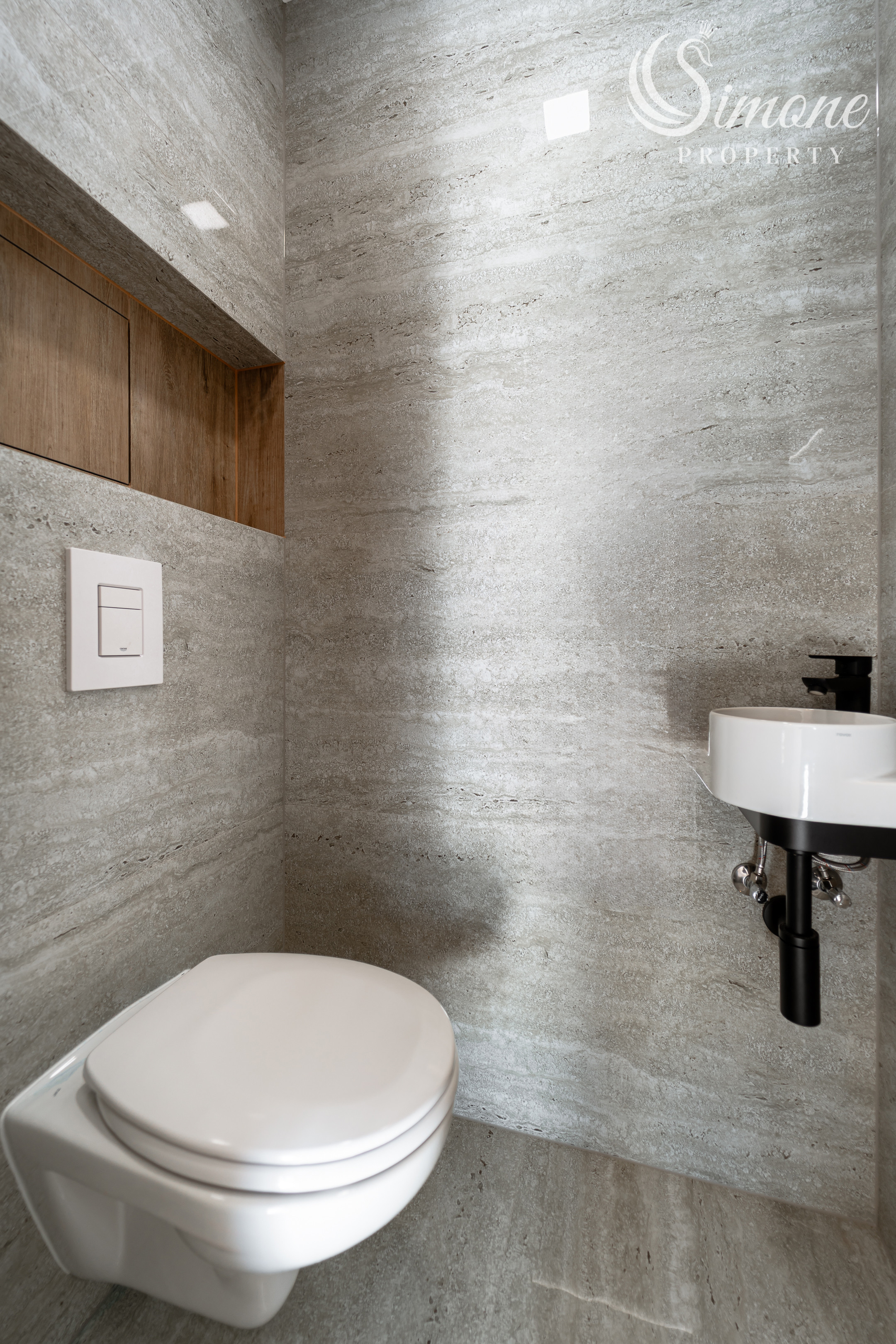 - Denno-Nočná Zóna: Priestor tvoria dve samostatné spálne s manželskou posteľou, nočnými stolíkmi a vstavanými skriňami, a dominantou bytu je priestranná denná zóna (obývacia izba, jedáleň, kuchyňa) prepojená do otvoreného konceptu. Kúpeľňa je vybavená walk-in sprchovým kútom a umývadlom so skrinkou. Toaleta s umývadlom je oddelená, čím zvyšuje komfort každodenného užívania.