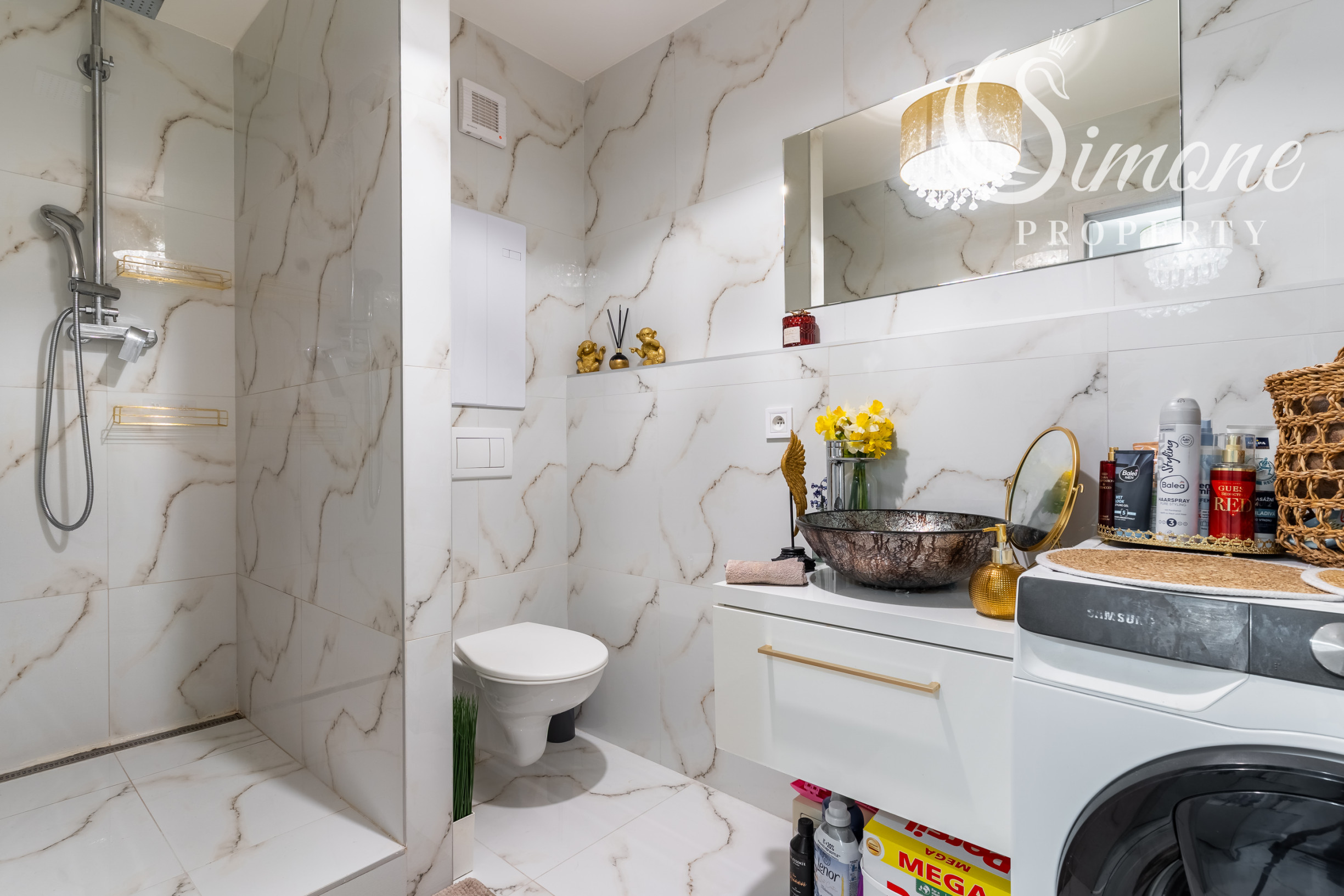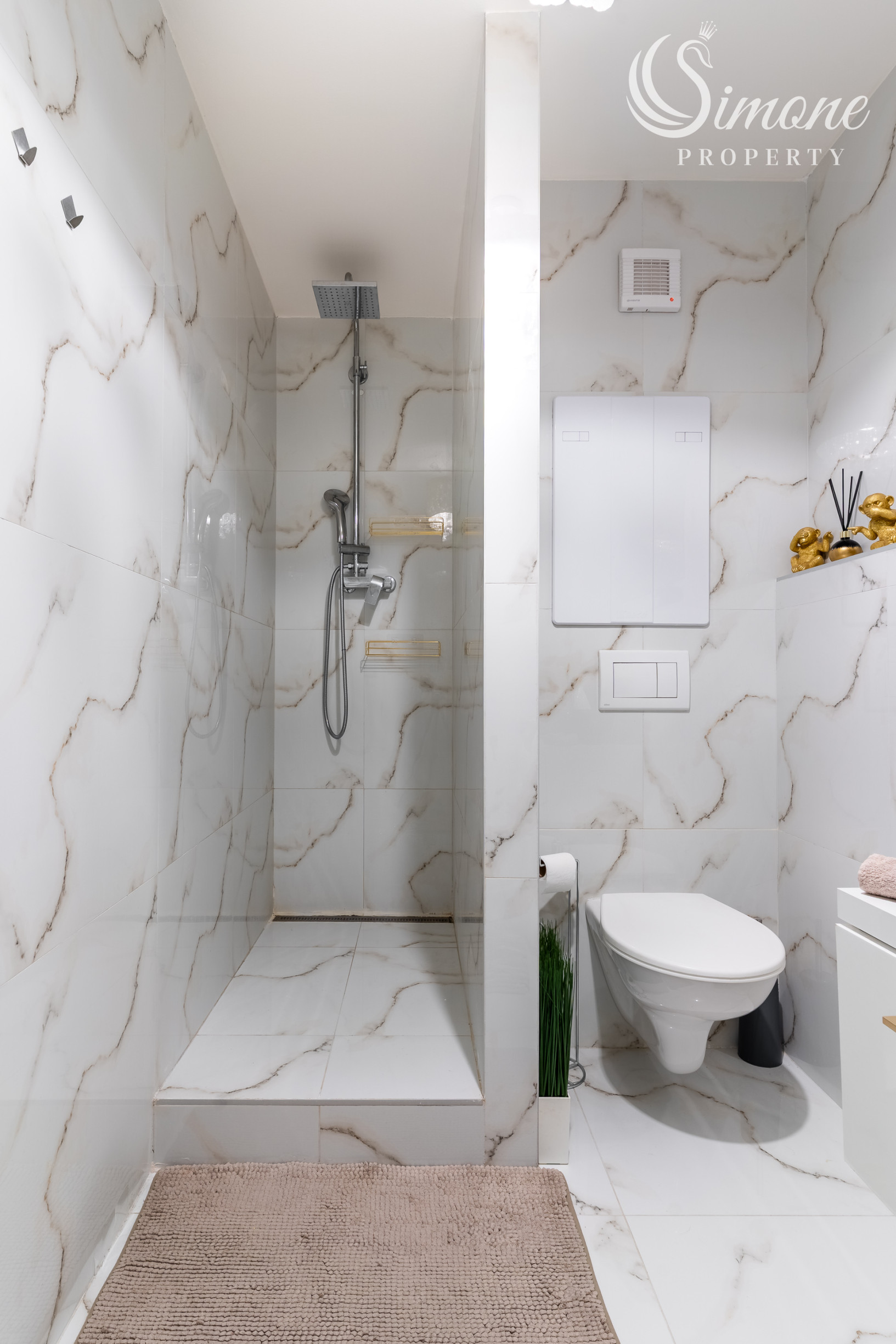 Murované jadro s luxusným obkladom v mramorovom dekore a walk-in sprchovým kútom.