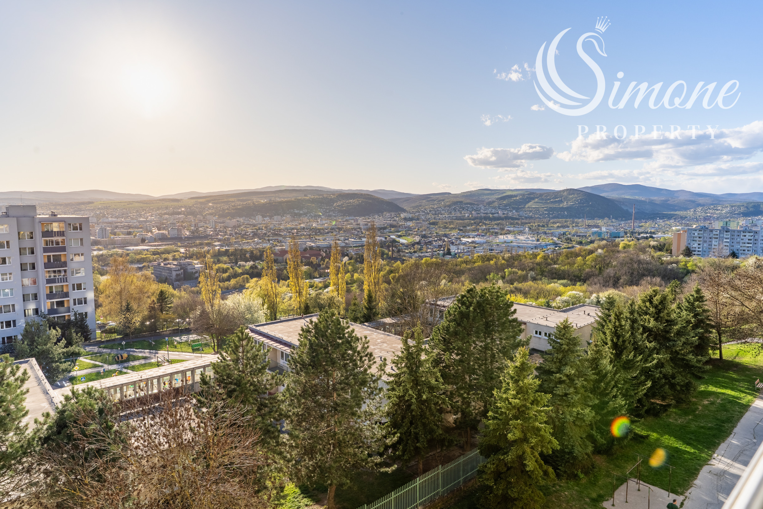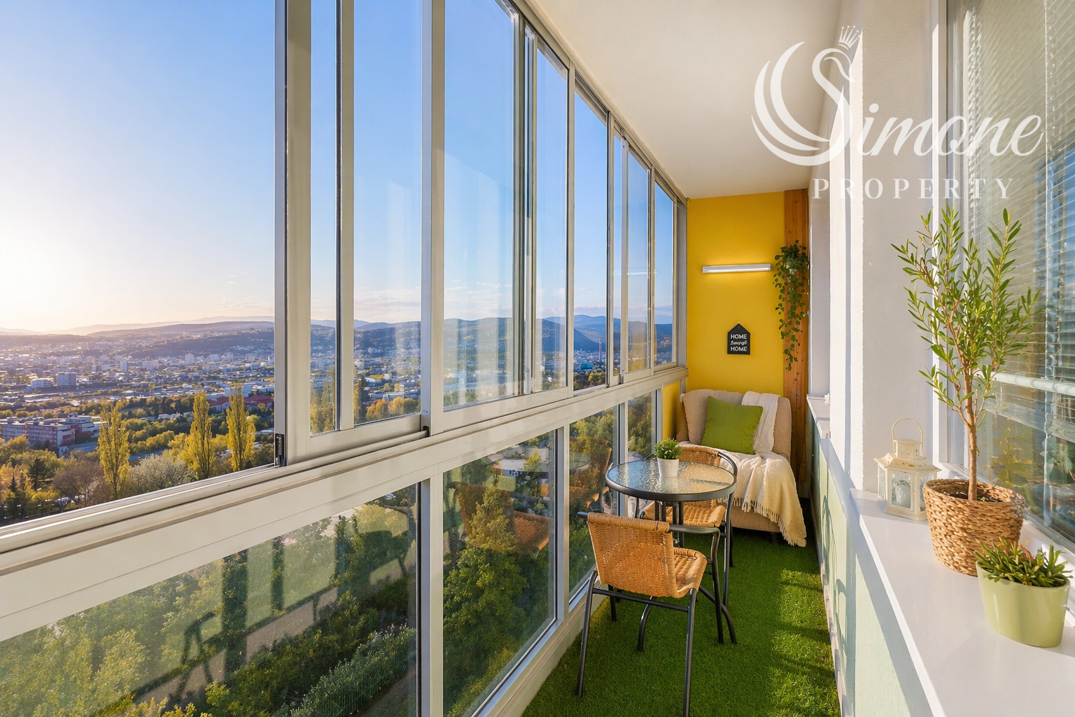 Výhľad, ktorý neomrzí: 6-metrová zasklená loggia slúži ako ďalšia izba, ideálna na rannú kávu alebo relax pri západe slnka nad Košicami.
