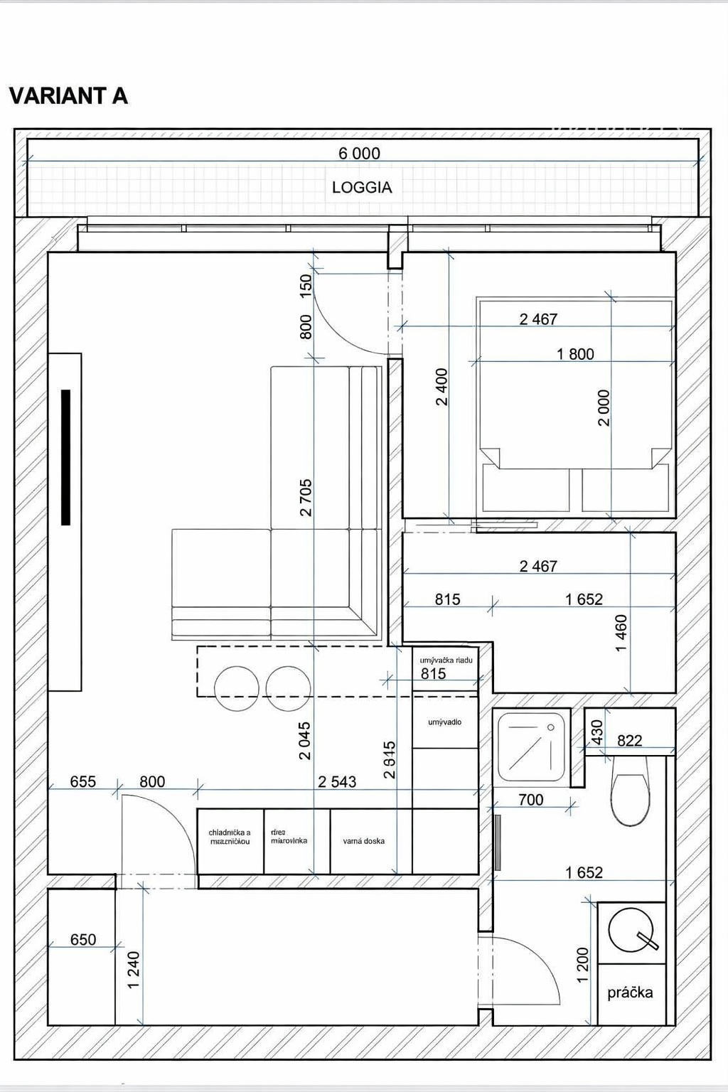 Dispozícia: 1,5-izbový byt s loggiou (oddelená spálňová časť a šatník)